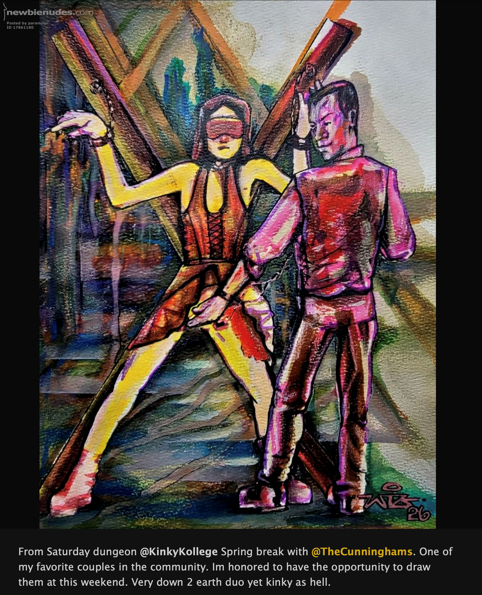 A write up what we got into over the weekend. Breakdown of the hotter parts of Friday night . 4 pieces of equipment. First Mrs P on a spanking bench but she wasn’t digging it. Then I got in a cage and she sucked my cock through the bars. Later she got on a sex sling with stirrups and I ate her pussy. Final was some sort of bench/saw horse thing I could strap her into in a doggie position. I had her suck my cock and I then ate her pussy and anus. This was the bench but with added knee strap attachments. https://huse.com/products/sex-bench Sat night got a St Andrews Cross first, tied Mrs to it and put TENS pads on her, gagged her and finger fucked. Our friend Go-strider420 who does sketches of scenes stopped on by so we may end up getting a sketch pic. Then we hit the sex swing again and I ate and fingered her while the TENS pads were still on. Took a break chatted with connections and then Mrs and our friend Lizzylove did a trampling session on a guy we met on Friday. Then I got into the cage again and she sucked my cock for a while. We then chatted with people again and watch some wild scenes. Eventually made it up to our room to fuck and finish for the night The sketch our friend Go-Strider420 did of us on the St Andrews Cross | ||||||